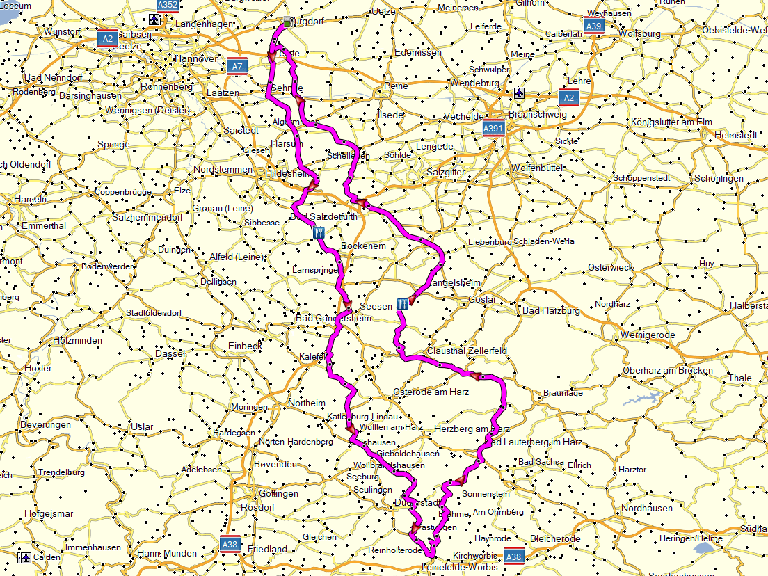 Wir folgen den kurvenreichen Abschnitten weiter in Richtung Süden, vorbei an Rhüden, Willershausen, Nienstedt am Harz und erreichen unseren südlichsten Punkt in Worbis. Wenige Kilometer nördlich machen wir einen Zwischenstopp an der Burg Bodenstein, wo wir im Restaurant eine kleine Stärkung zu uns nehmen können. Weiter führt uns der Weg über kurvige Streckenabschnitte in nordöstliche Richtung nach Bad Lauterberg und von dort vorbei an Clausthal-Zellerfeld zum Seestübchen an der Innerste Talsperre, wo eine echte Thüringer Bratwurst auf uns wartet. Von dort führt der weitere Weg über Nettlingen, Hohenhameln wieder nach Burgdorf. Wer möchte, macht iin der Eisdiele "Am alten Spritzenhaus" in Hohenhameln einen letzten Zwischenstopp.